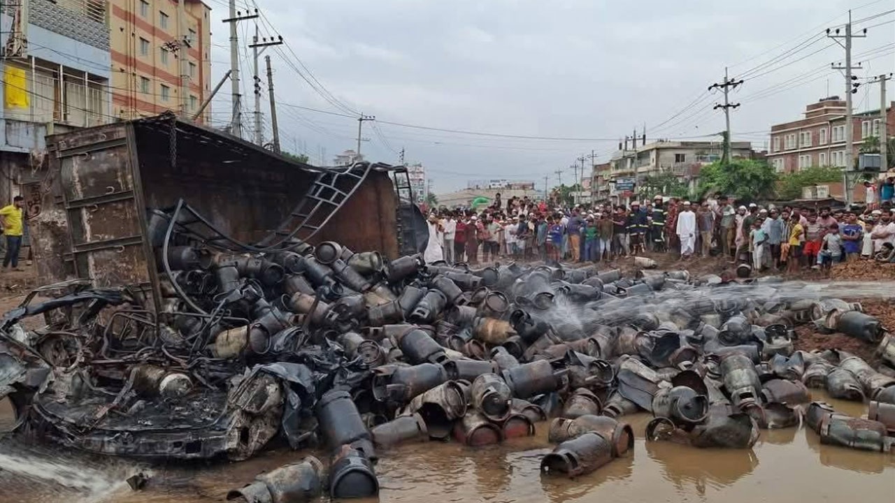 মহাসড়কে ২ শতাধিক গ্যাস সিলিন্ডারবাহী ট্রাক উল্টে বিস্ফোরণ